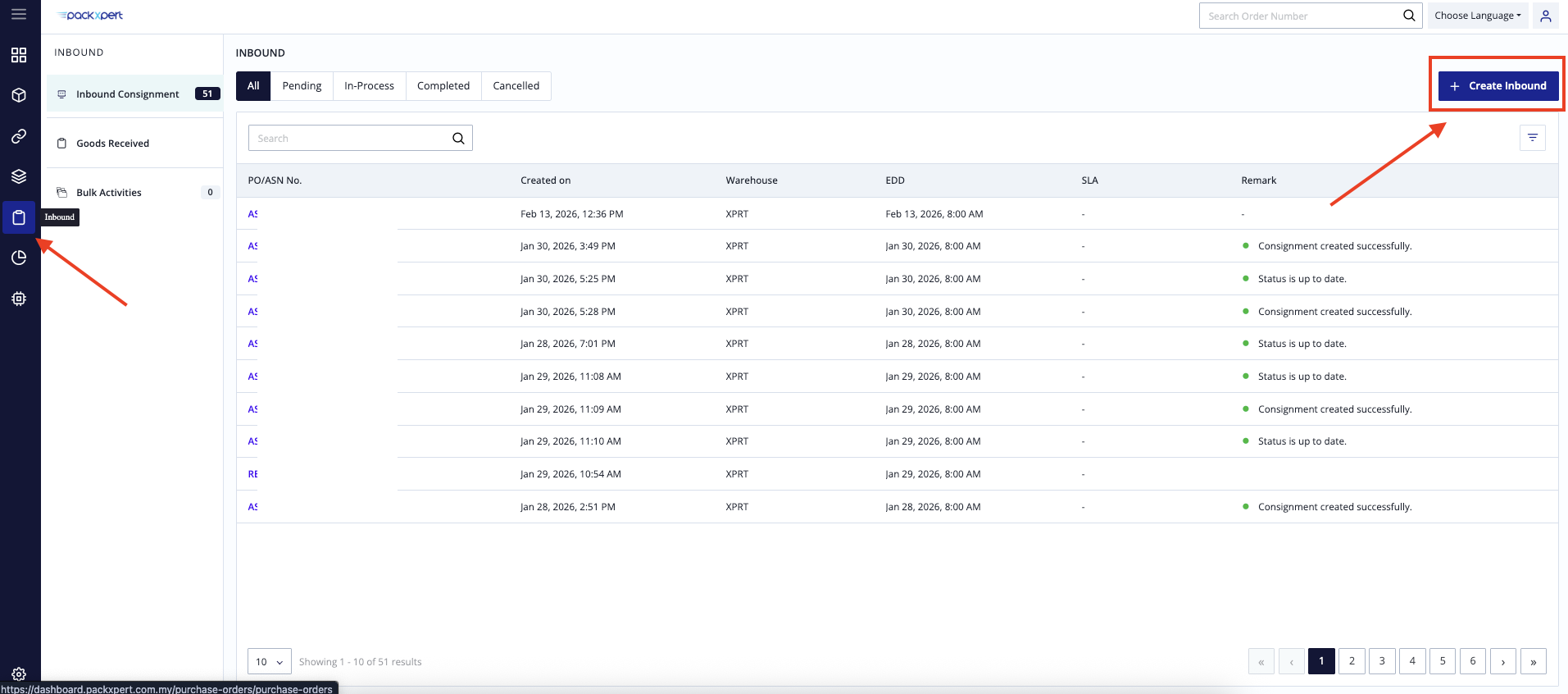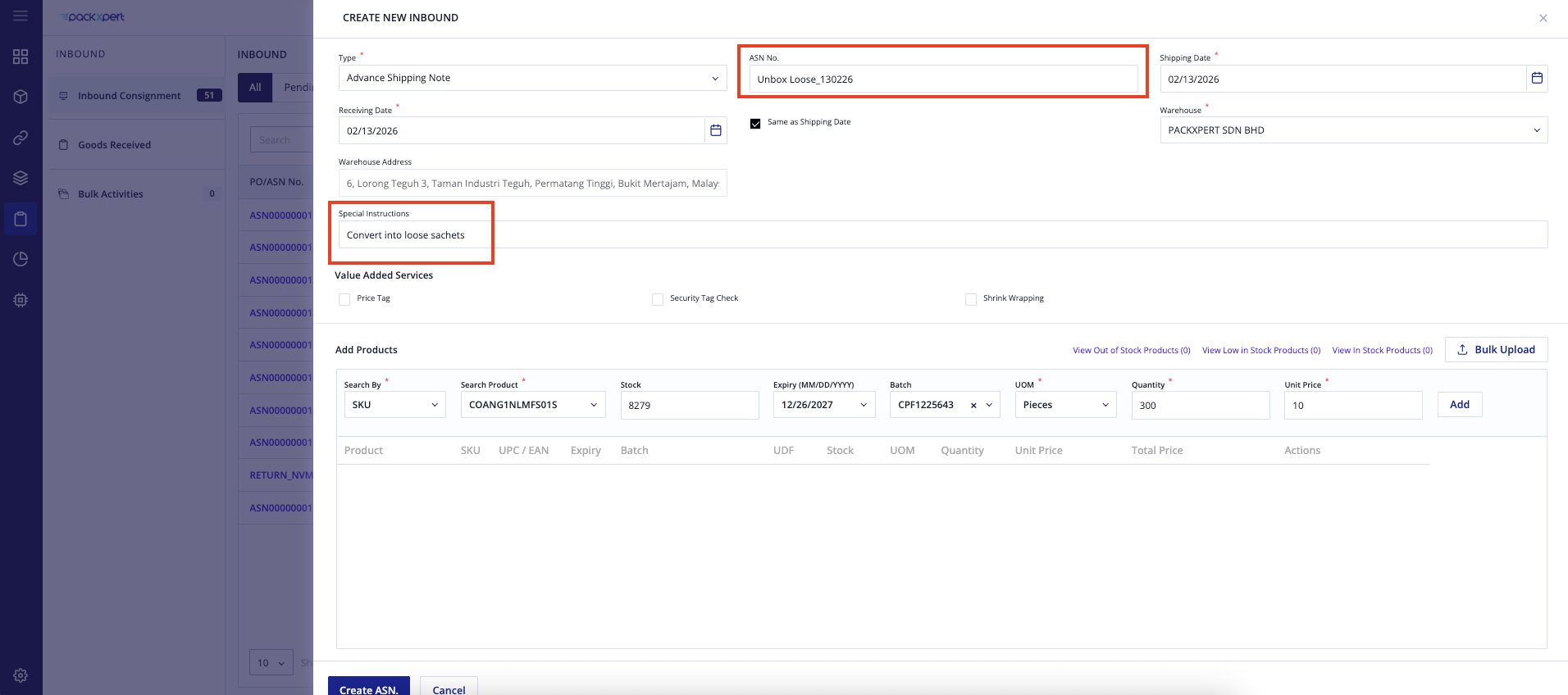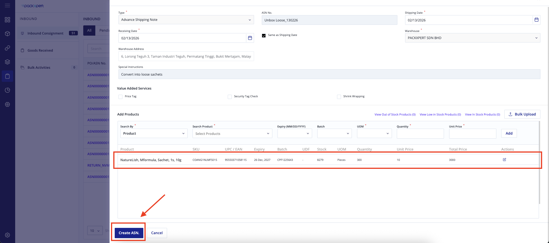 Please make sure the product has been successfully added, then click “Create ASN”.
